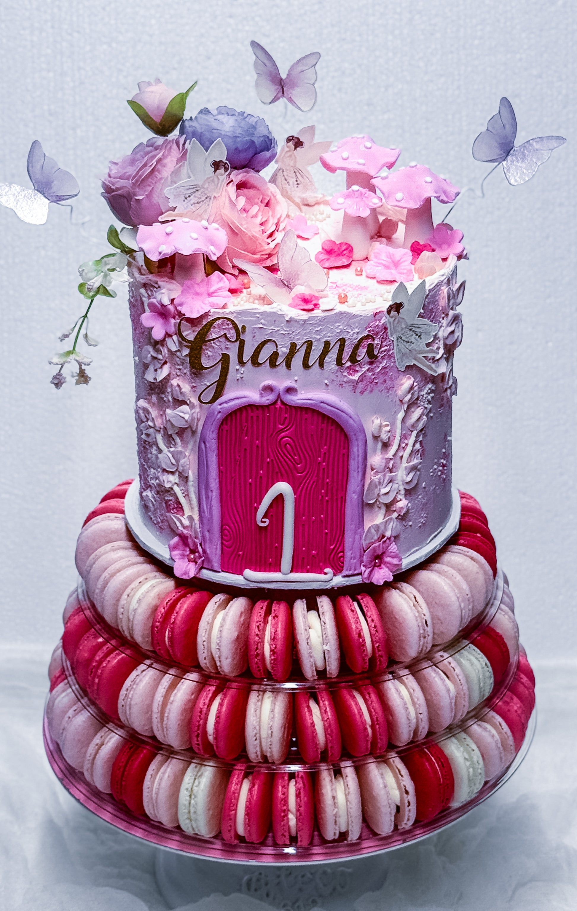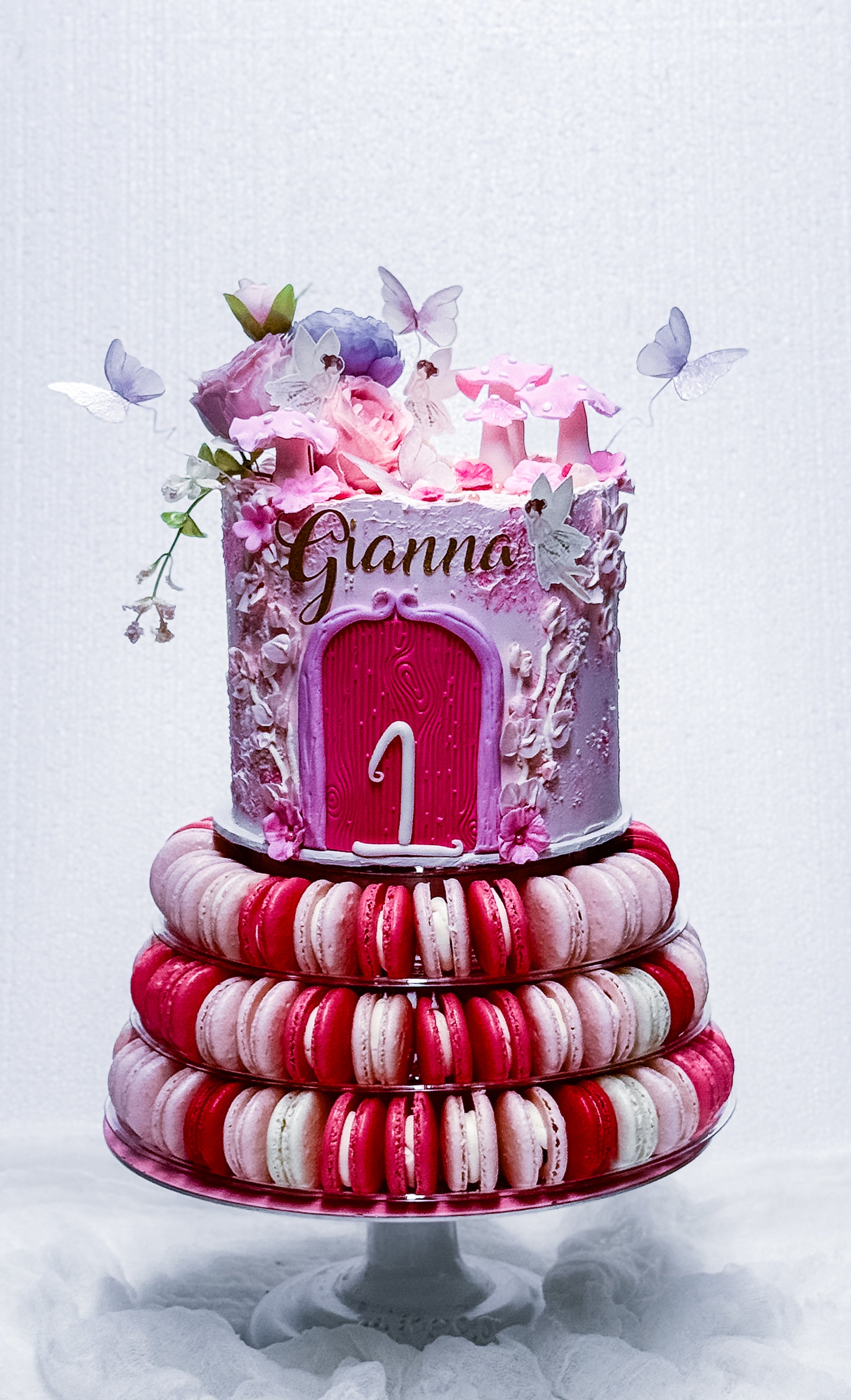 Consist of 100 pcs of macarons and a size 7x6 inches cake with any desired design.