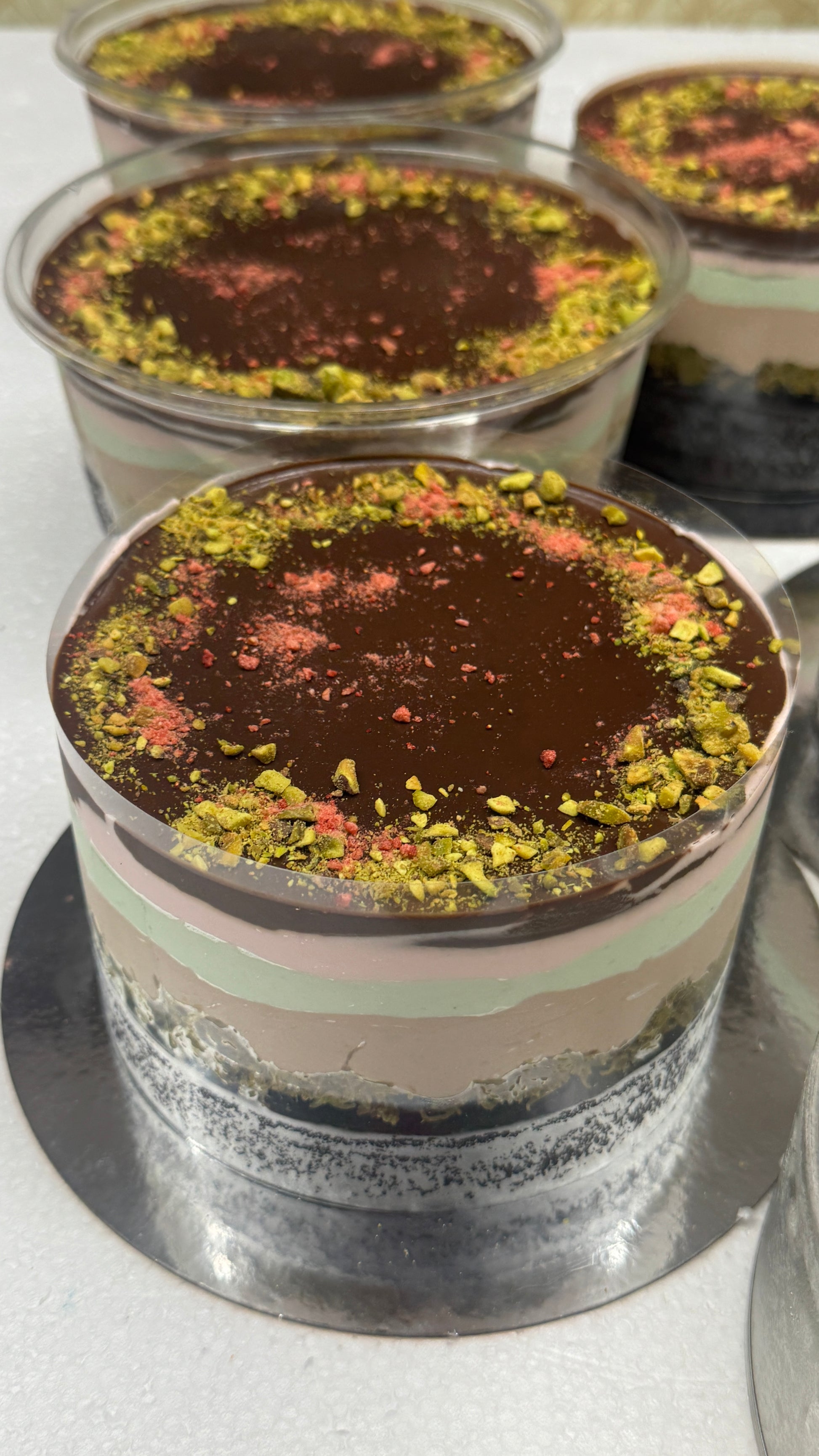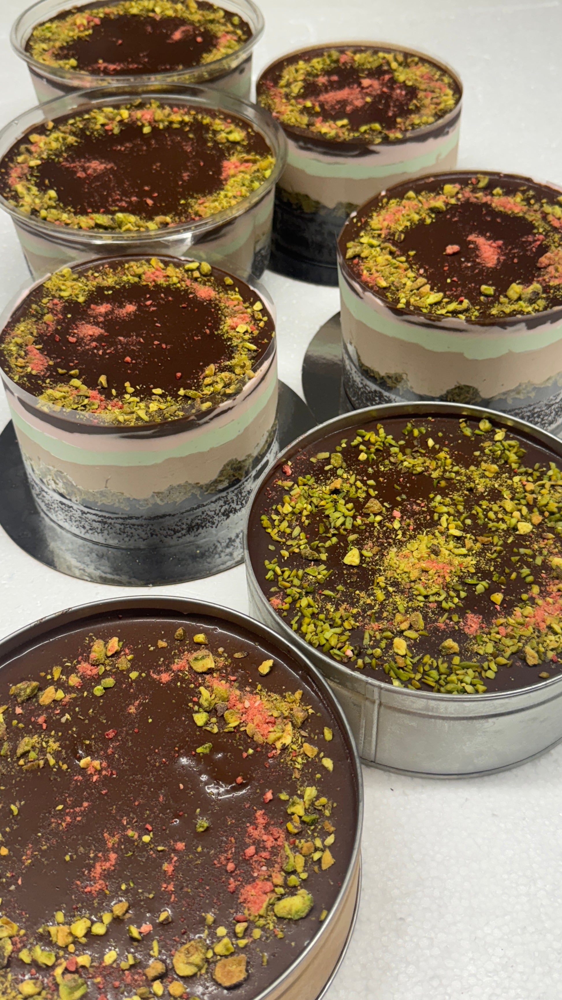 Indulge in the rich flavour of Dubai with our decadent Chocolate Crunch Pistachio Cake. Moist chocolate cake is layered with crunchy pistachio, chocolate, strawberry mouse, smooth chocolate ganache and drizzled with pistachio cream. Creating a truly unforgettable dessert experience. This luxurious cake is a perfect blend of textures and flavour.